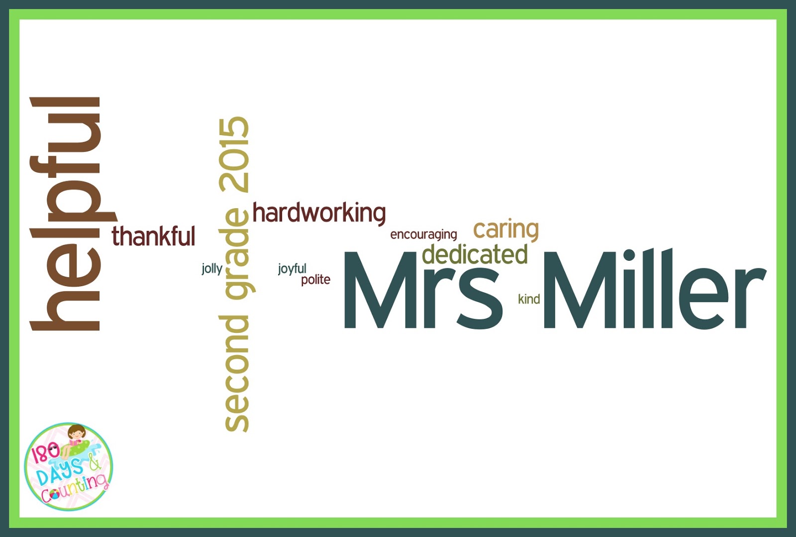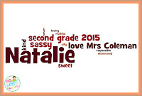 The whole project was created in Wordle. If you've never used Wordle, it's pretty awesome. The more you type the same word, the larger it will get. You'll notice that their names are the largest on the paper because I typed them eight times each. The other word sizes were determined by what the other kids said about them.